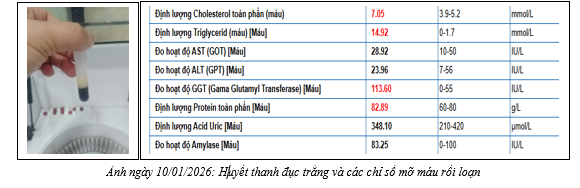 Sau khi lấy máu làm các xét nghiệm, không ngoài chẩn đoán, các chỉ số về mỡ máu và chức năng gan của người bệnh rất xấu, nguy cơ cao dẫn đến tắc thành mạch máu, nhồi máu cơ tim, dễ dẫn đến đột quỵ. Khai thác cách ăn uống, sinh hoạt, biết thêm rằng người bệnh chạm ngưỡng 50 tuổi, lao động chân tay nặng nhọc, thường xuyên ăn lòng lợn và dùng bia rượu. Những yếu tố này dẫn đến rối loạn chuyển hoá lipid, một trong những nguyên nhân hàng đầu dẫn đến các vẫn đề nguy kịch. Đặc biệt, nồng độ Triglycerid trong máu rất cao, làm huyết thanh đục trắng, chính là những yếu tố gây chít hẹp thành mạch, dẫn đến tắc mạch máu.