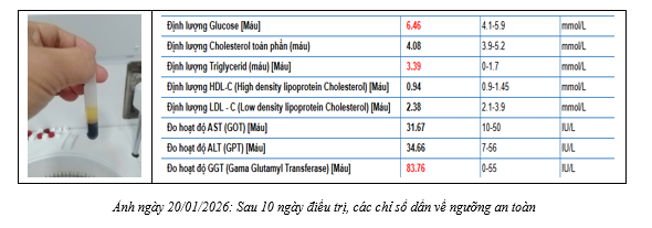 Sau 10 ngày điều trị bằng thuốc hạ mỡ máu và các thuốc khác, cùng với việc tuyệt đối tuân thủ chế độ ăn lành mạnh, không sử dụng rượu bia, kiêng các thức ăn từ ngũ tạng động vật và hạn chế ăn dầu mỡ, các chỉ số đã dần về mức an toàn, huyết thanh đã dần trong trở lại, nguy cơ đột quỵ đã giảm thiểu đáng kể.